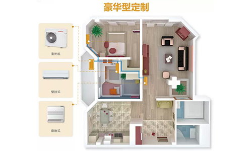 IMS变频家用多联机可以同时调节5个房间的温度,室外机的容量可达11KW,室内机为暗藏风管机,容量从1匹至2匹。三房一厅的小型居室(建筑面积小于120平方米)